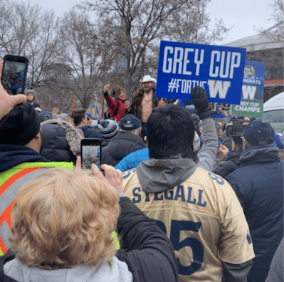 Mitayango rushing through barriers on the field for Winnipeg